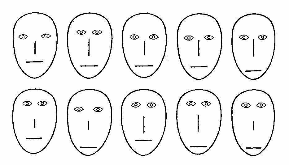 여러분은 윗줄과 아랫줄의 얼굴들이 어떻게 달라 보이는가? 실험참가자들이 새 얼굴들을 분류한 자료를 조사해 보니 그들은 이런 얼굴 배후에 있는 기본형태(얼굴 상)을 가지고 있는 것처럼 보였다. 그것들을 직접 배운 적이 없는데도 불구하고. 그러니까 우리는 여러 얼굴들을 경험하면서, 우리가 ‘말 상’, ‘원숭이 상’이라고 부르는, 얼굴 배후의 어떤 ‘상’을 마음속에서 만들어내는 것으로 보인다. 이 ‘얼굴 상’은 이목구비들의 크기나 간격 등에서 생기는 관계(그림을 보라), (달걀형, 세모 형이라 할 때의) 얼굴의 외형, 그리고 위 몽타주의 경우처럼 양감(볼륨감) 등에서 생길 것이다.